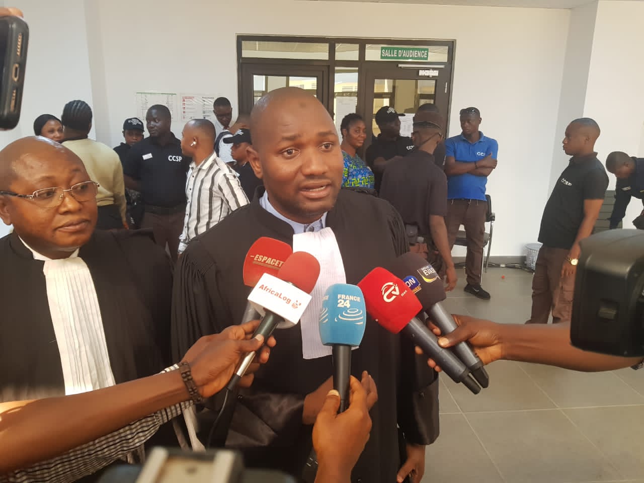 ‘’Nous sommes venus signifier au tribunal notre décision de suspendre notre participation au procès jusqu’à ce que les conditions soient créés pour garantir à nos clients leur droit d’accès à leurs avocats’’, a déclaré Maître Almamy Samory Traoré à fin de l’audience.