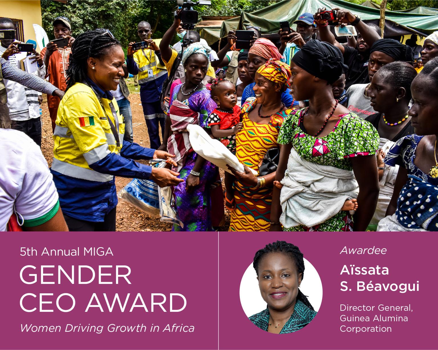 [dropcap]K[/dropcap]amsar, le vendredi 21 février 2020— Guinea Alumina Corporation S.A (GAC) est fière d’annoncer que Mme Aissata Béavogui, directrice générale de la société recevra le prestigieux prix « MIGA Gender CEO Awards 2020 » décerné annuellement par l’Agence Multilatérale de Garantie des Investissements (MIGA), membre du groupe Banque Mondiale. Mme Béavogui recevra ce prix le 5 mars prochain dans le cadre d’une cérémonie officielle qui aura lieu siège social de la Banque Mondiale à Washington.