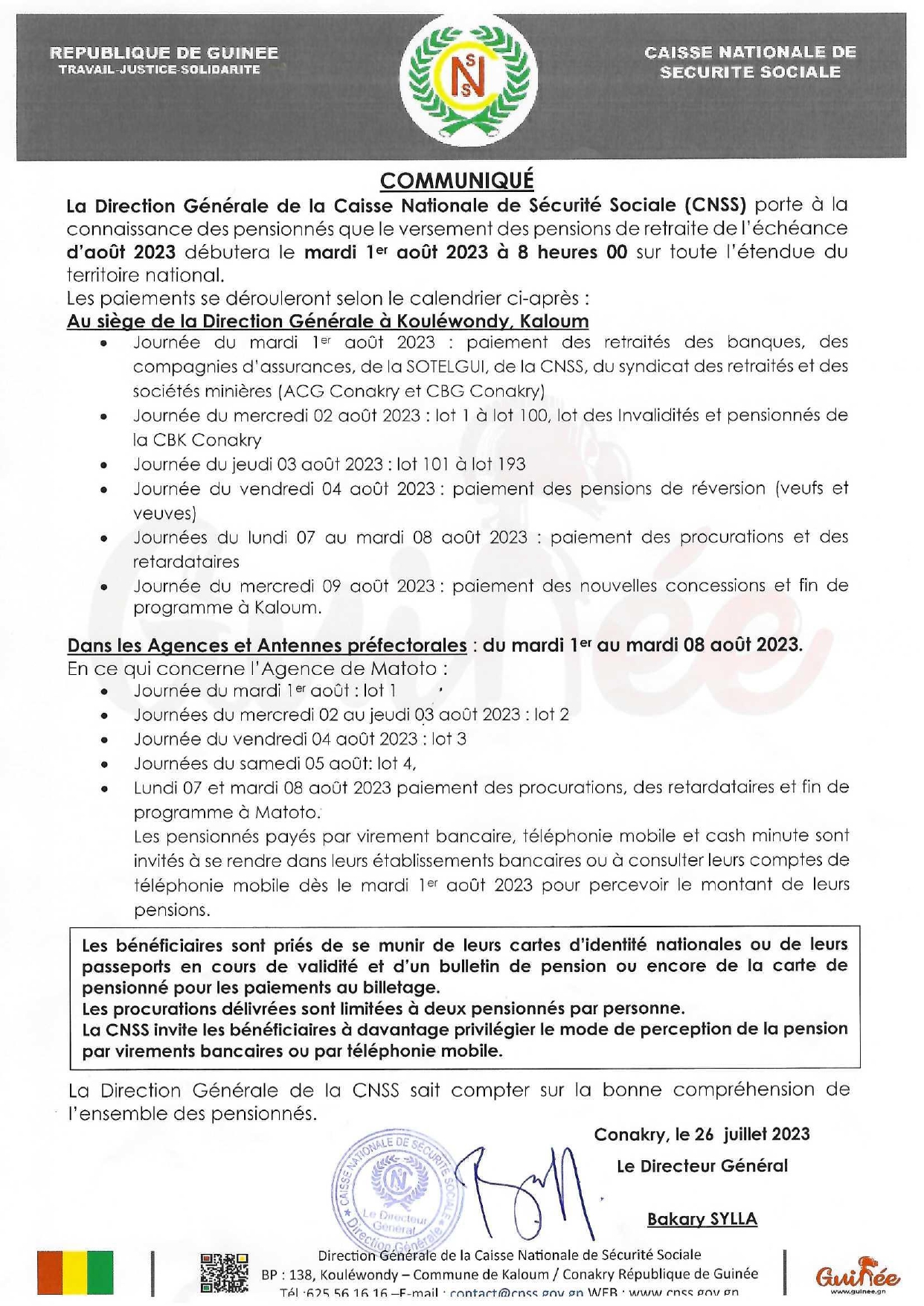 La Direction Générale de la Caisse Nationale de Sécurité Sociale (CNSS) porte à la connaissance des pensionnés que le versement des pensions de retraite de l’échéance de aout 2023 débutera le mardi 1er juin 2023 à 8 heures 00 sur toute l’étendue du territoire national.
