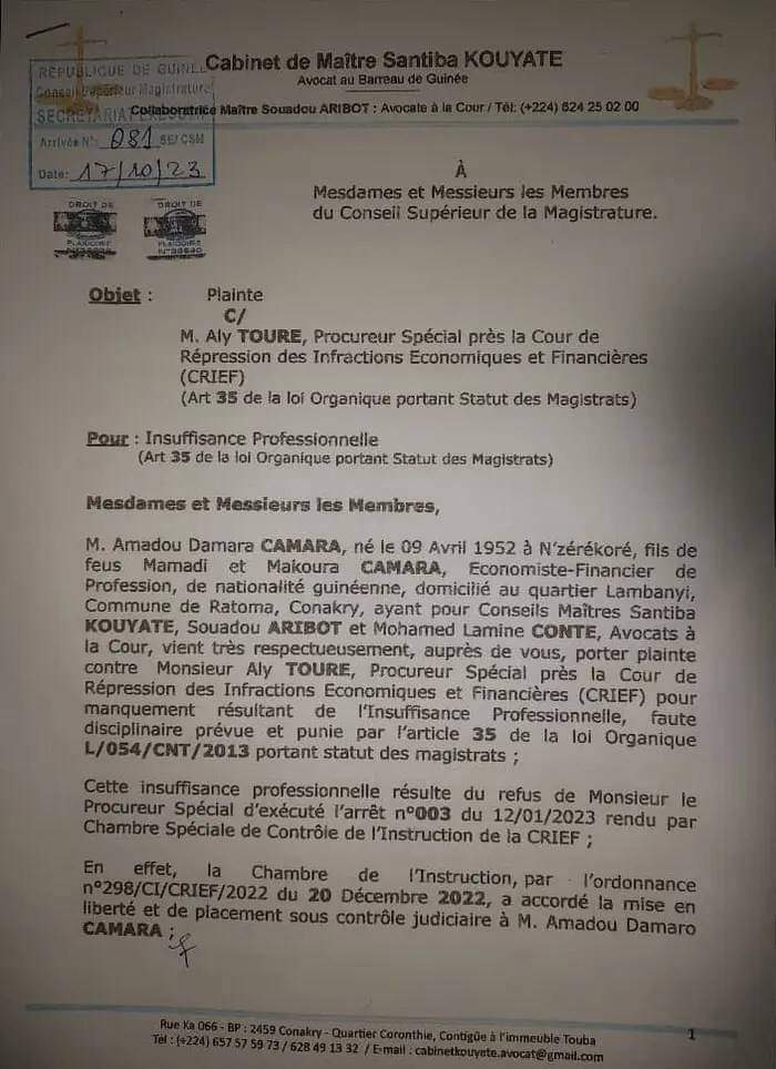 La plainte, en date du lundi 16 octobre 2023, a été transmise par son avocat Maître Santiba Kouyaté au Conseil supérieur de la magistrature.