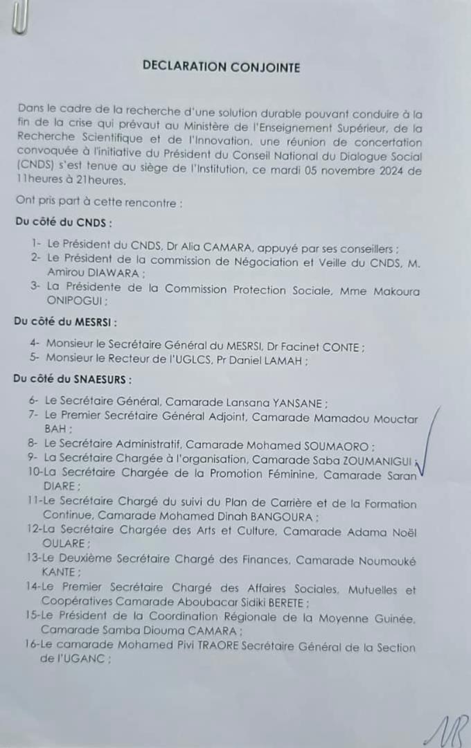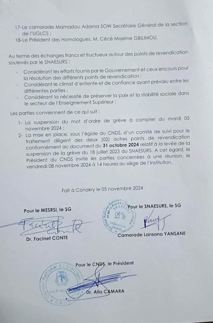 Sous l’égide du Conseil national du dialogue social, un comité de suivi pour le traitement diligent des deux (02) autres points de revendication a été mis en place, conformément au document du 31 octobre 2024 relatif à la levée de la suspension de la grève du 18 juillet 2023 du SENASUR.
