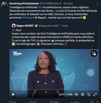 Contactée dans le cadre de notre enquête, la présentatrice Tchimbakala n’a pas souhaité réagir à cette vidéo. Mais sur son compte X, elle a indiqué que “l’intelligence artificielle (IA) se perfectionne”, avant d’appeler à la vigilance. “Observez les mouvements des lèvres… La voix et le texte ont été fabriqués par ordinateur et plaqués sur la vidéo. Surtout, si vous m’entendez prononcer #Mbappé M-Bappé… sachez que ce n’est pas moi!
