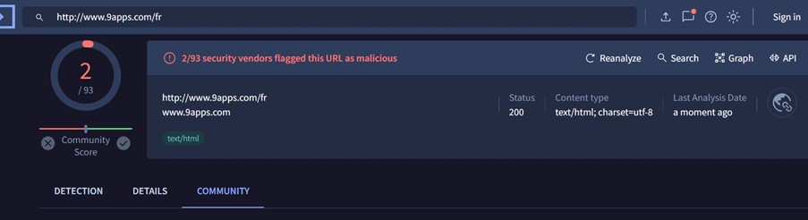 L’analyse du lien de l’application avec l’outil virustotal a mis en évidence la présence de virus pouvant infecter ou endommager un appareil.