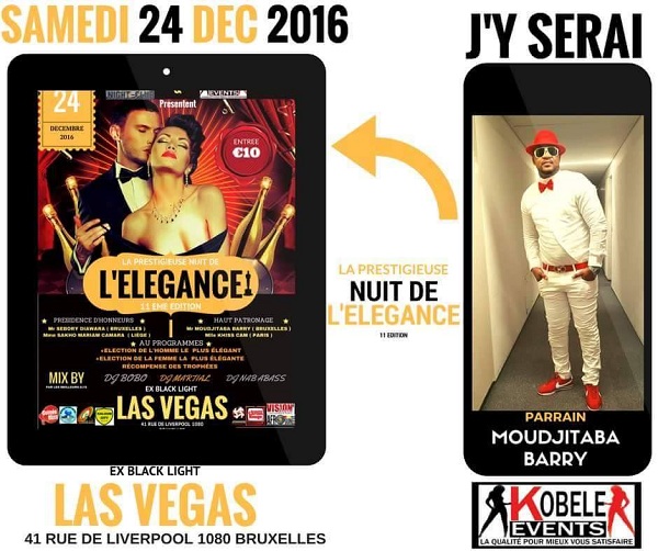 [dropcap]C[/dropcap]omme tous les ans, Kobélé Events vous convie à la prestigieuse à la 11e édition de la ‘’Nuit de l’élégance’’ le samedi 24 décembre 2016 à Las Vegas (Ex Black Light). Adresse: 41 Rue de Liverpool, 1800 Bruxelles. Horaire : de 23h30 à l’aube. Tarif : €10
