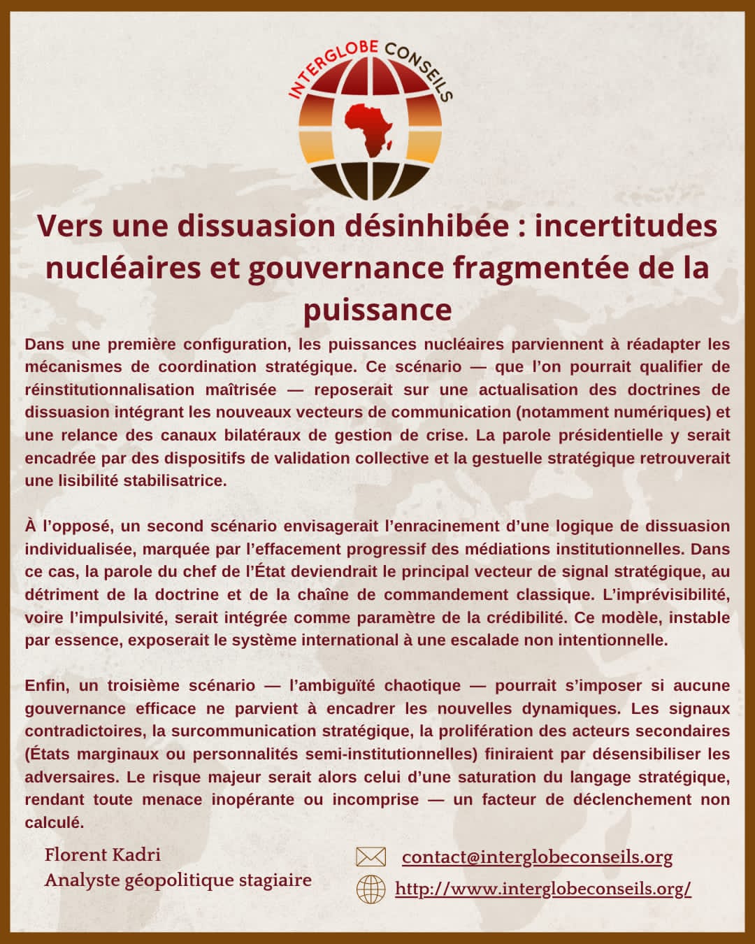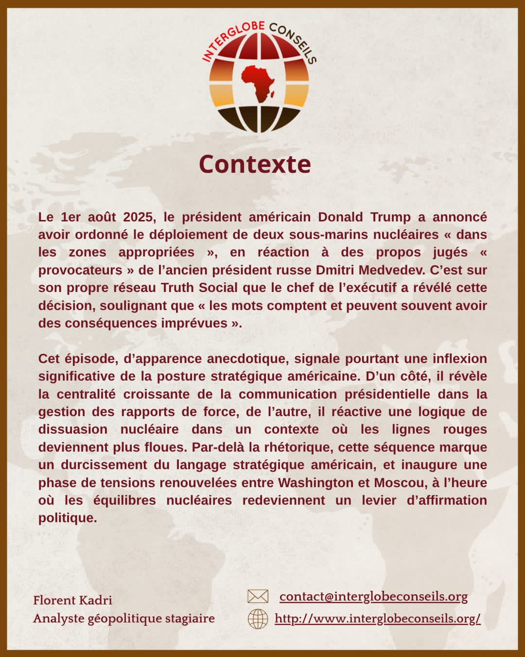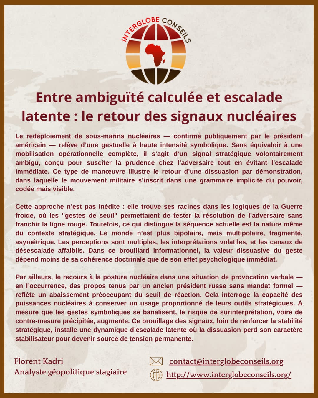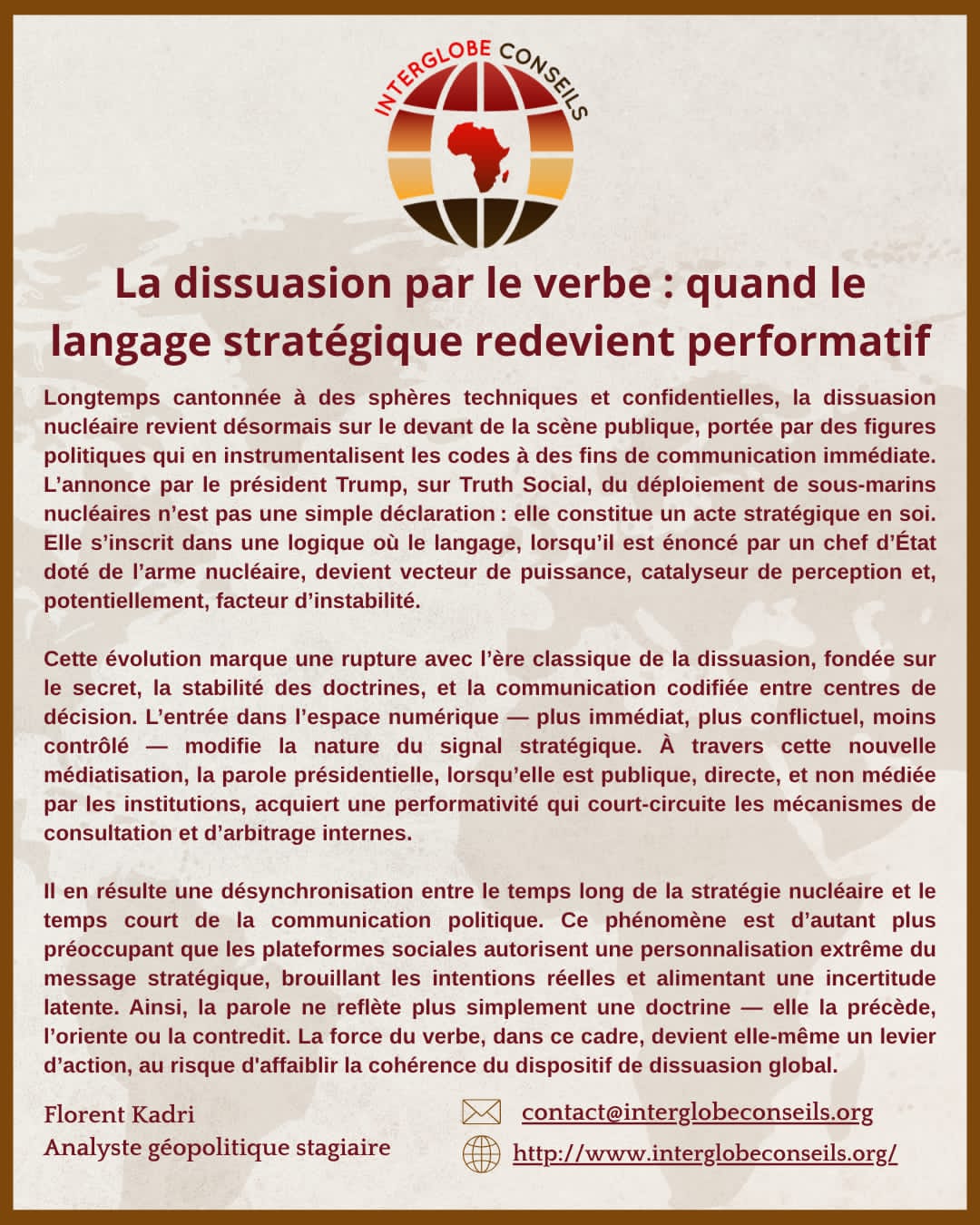 Derrière ce geste spectaculaire, une transformation plus profonde se dessine : celle d’une dissuasion nucléaire qui s’exprime désormais dans l’arène publique, via une parole présidentielle directe, immédiate et non filtrée. Par Florent Kadri, analyste géopolitique junior, InterGlobe Conseils.