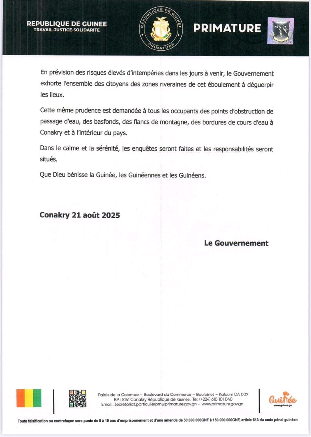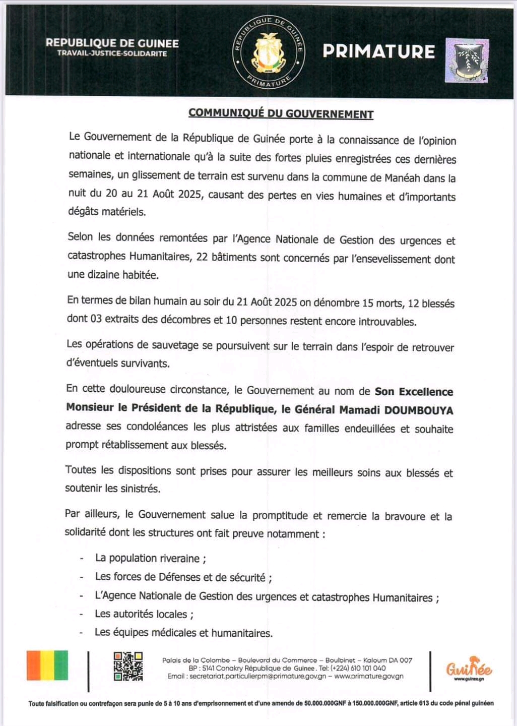 Face au drame survenu à Manéah dans la nuit du 20 au 21 août 2025, où un glissement de terrain a coûté la vie à plusieurs citoyens, le gouvernement guinéen lance un appel pressant à l’évacuation immédiate des zones exposées aux risques d’éboulements et d’inondations.