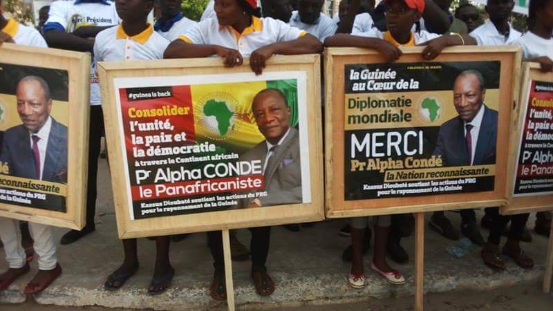 Des jeunes de Kaloum sont sortis en masse pour accueillir le président de la République avec des pancartes sur lesquelles on pouvait lire « La Guinée au coeur de la diplomatie mondiale. Merci Alpha Condé ».