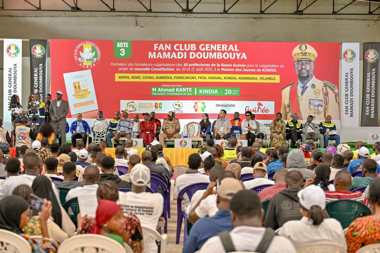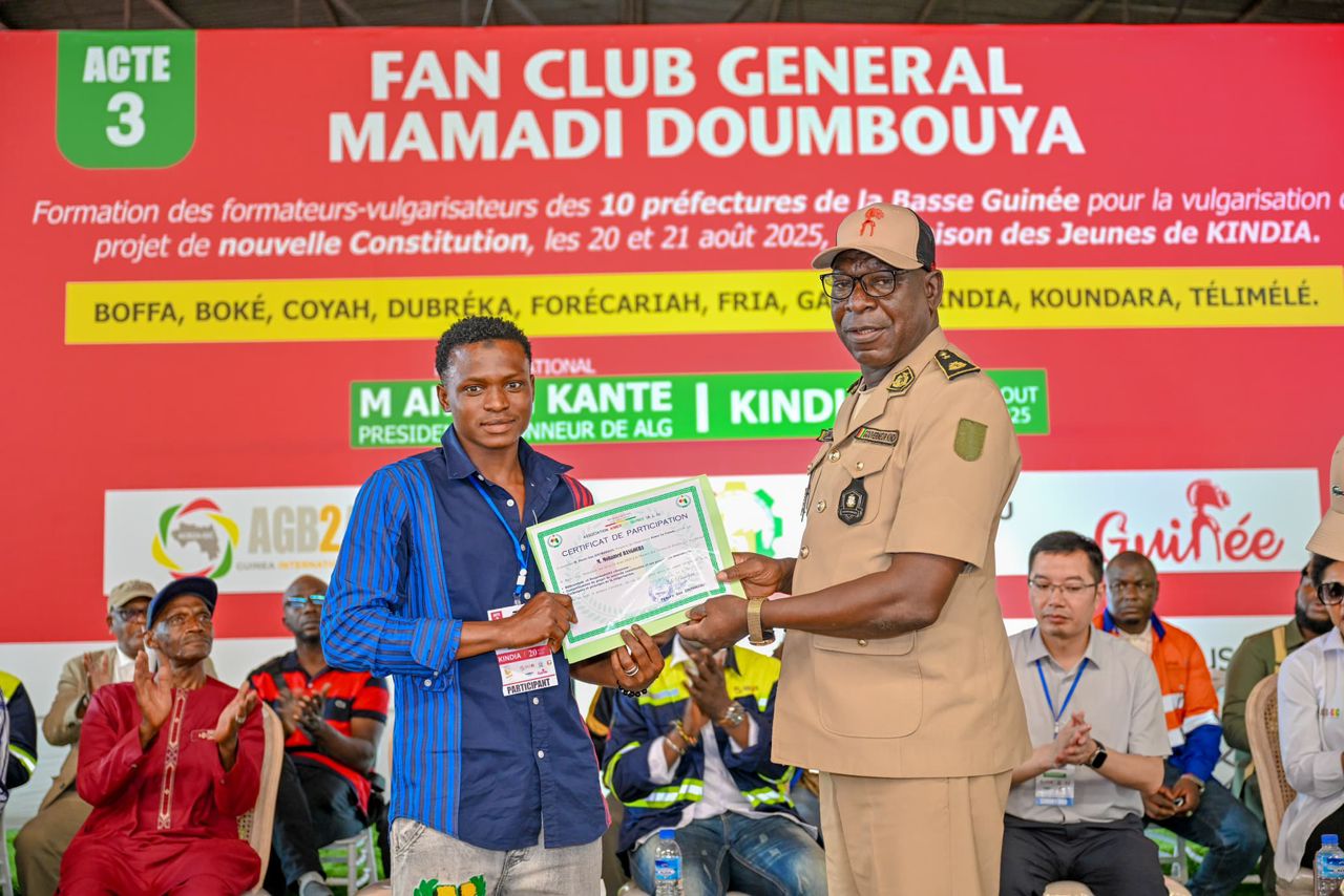 Kindia a accueilli ce jeudi la clôture d’une session de formation citoyenne dédiée à la vulgarisation de la nouvelle Constitution. L’événement a réuni 193 participants venus des préfectures, sous-préfectures et quartiers de la région. Organisée par le Fan Club Général Mamadi Doumbouya, en partenariat avec l’association Aimer la Guinée et soutenue par l’entreprise minière AGB2A-GIC, cette initiative visait à renforcer l’engagement civique des jeunes.