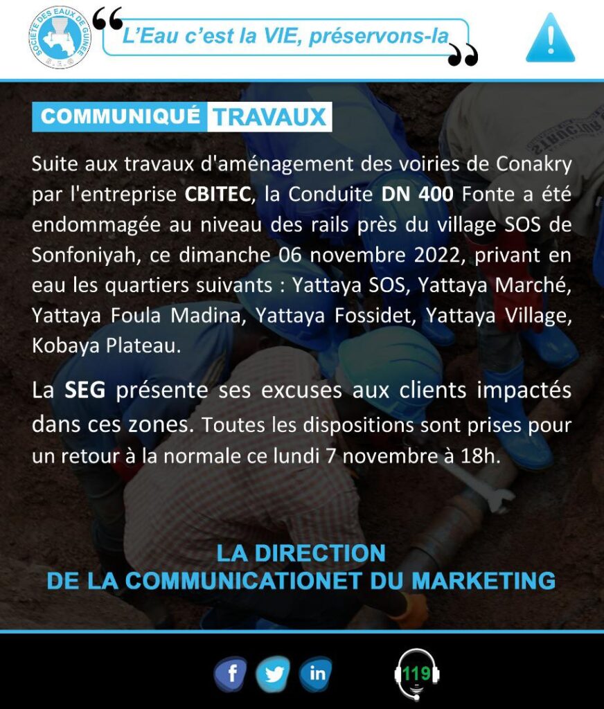 La conduite DN 400 fonte a été endommagée suite aux travaux d’aménagement des voieries de Conakry par l’entreprise CBITEC, la Direction de la Communication et du Marketing de la SEG informe que plusieurs quartiers dont Yattaya SOS, Yattaya Marché, et plusieurs autres seront impactés.
