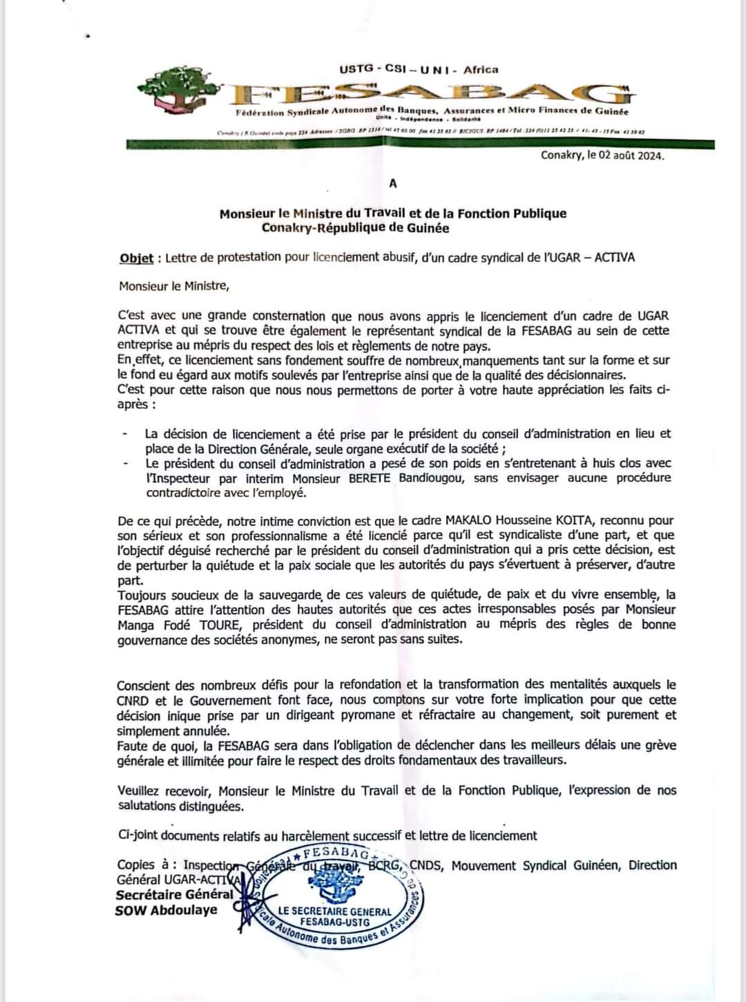La Fédération syndicale autonome des travailleurs de banques, assurances et microfinances de Guinée (FESABAG) a adressé au ministre du travail et de la fonction publique une lettre de protestation pour ‘’licenciement abusif’’ de Makalo Housseine Koita, cadre syndical de la société UGAR-Activa.
