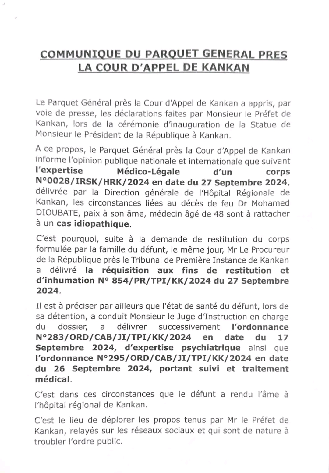 Selon le parquet général de Kankan, l’état de santé du défunt, lors de sa détention, avait conduit le juge d’Instruction en charge du dossier, à délivrer successivement une ordonnance d’expertise psychiatrique ainsi qu’une autre portant suivi et traitement médical.