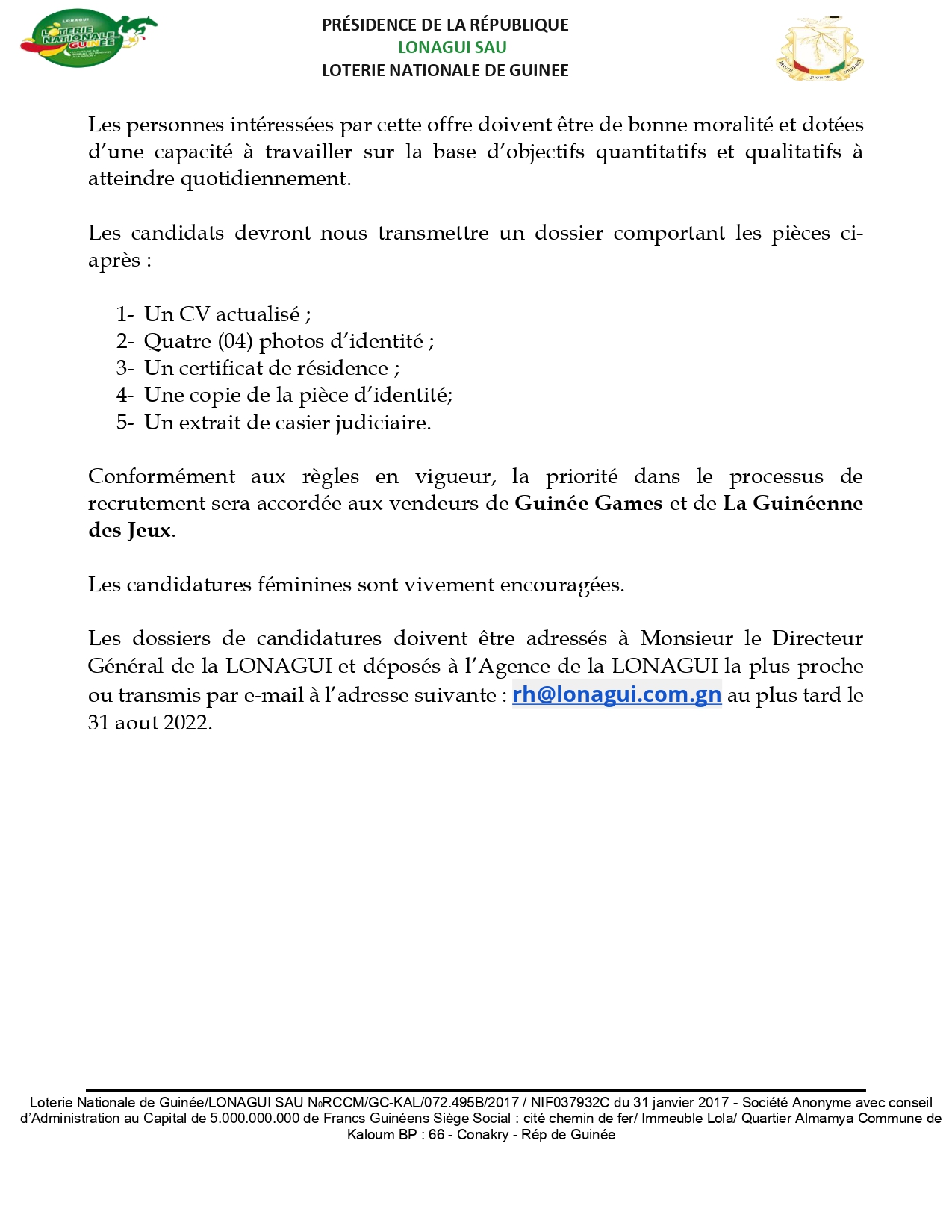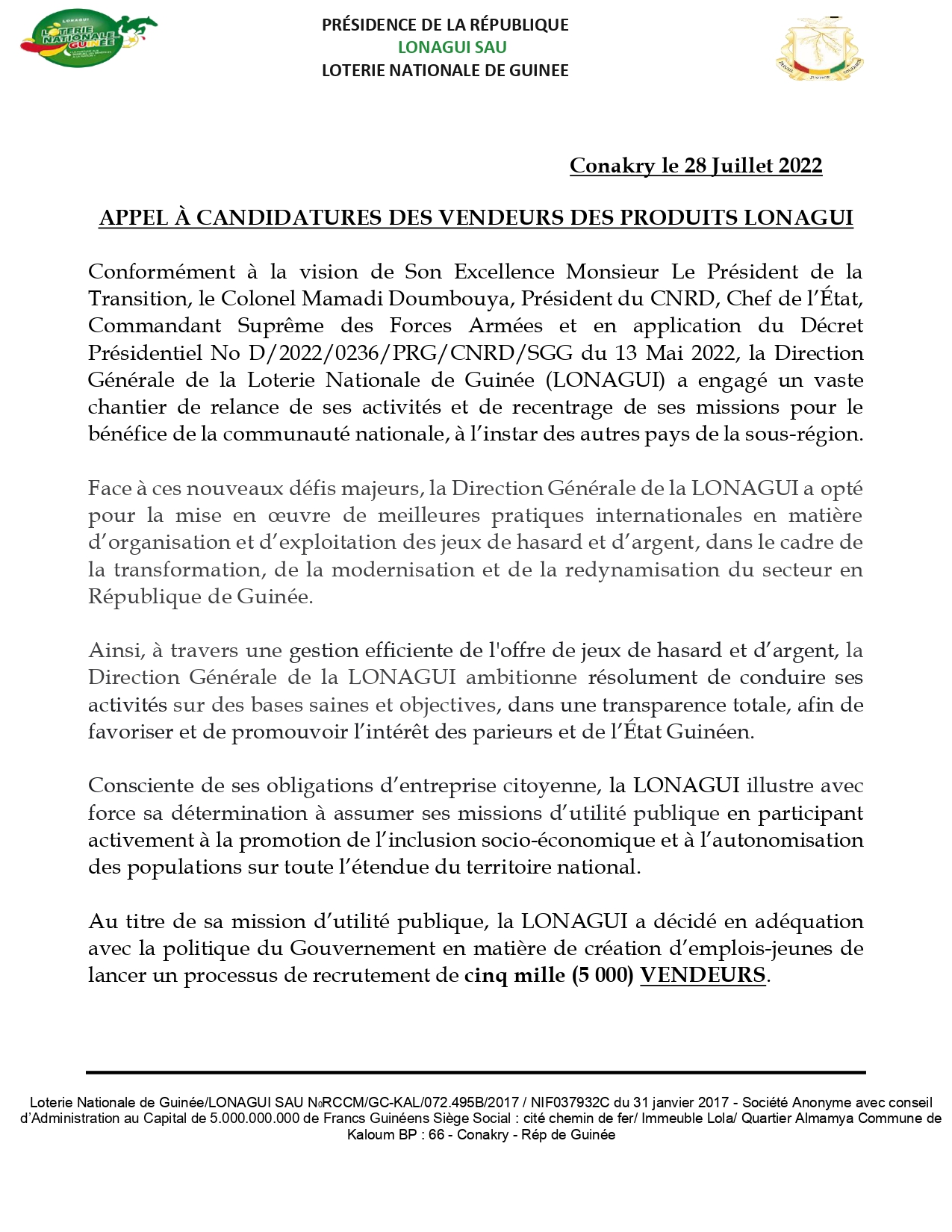 La LONAGUI lance un processus de recrutement de 5000 vendeurs Annonces Last updated Juil 28, 2022 0 Share 0 Share