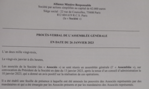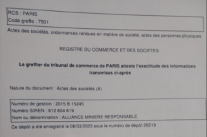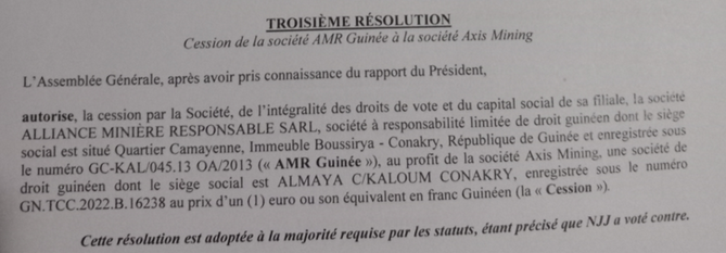 Extraits du document du Tribunal de Commerce de Paris actant la cession des actions d’AMR SARL à Axis Mining SAU