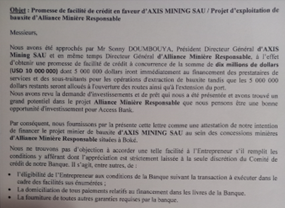 Or, il apparaît au cours de notre enquête que la « capacité technique et financière » des nouveaux partenaires d’AMR paraît non seulement indiscutable mais une grande banque commerciale a accepté d’accompagner le projet pour un montant de 10 millions de dollars USD (voir extrait du document ci-dessous) à condition que l’approbation soit acquise.