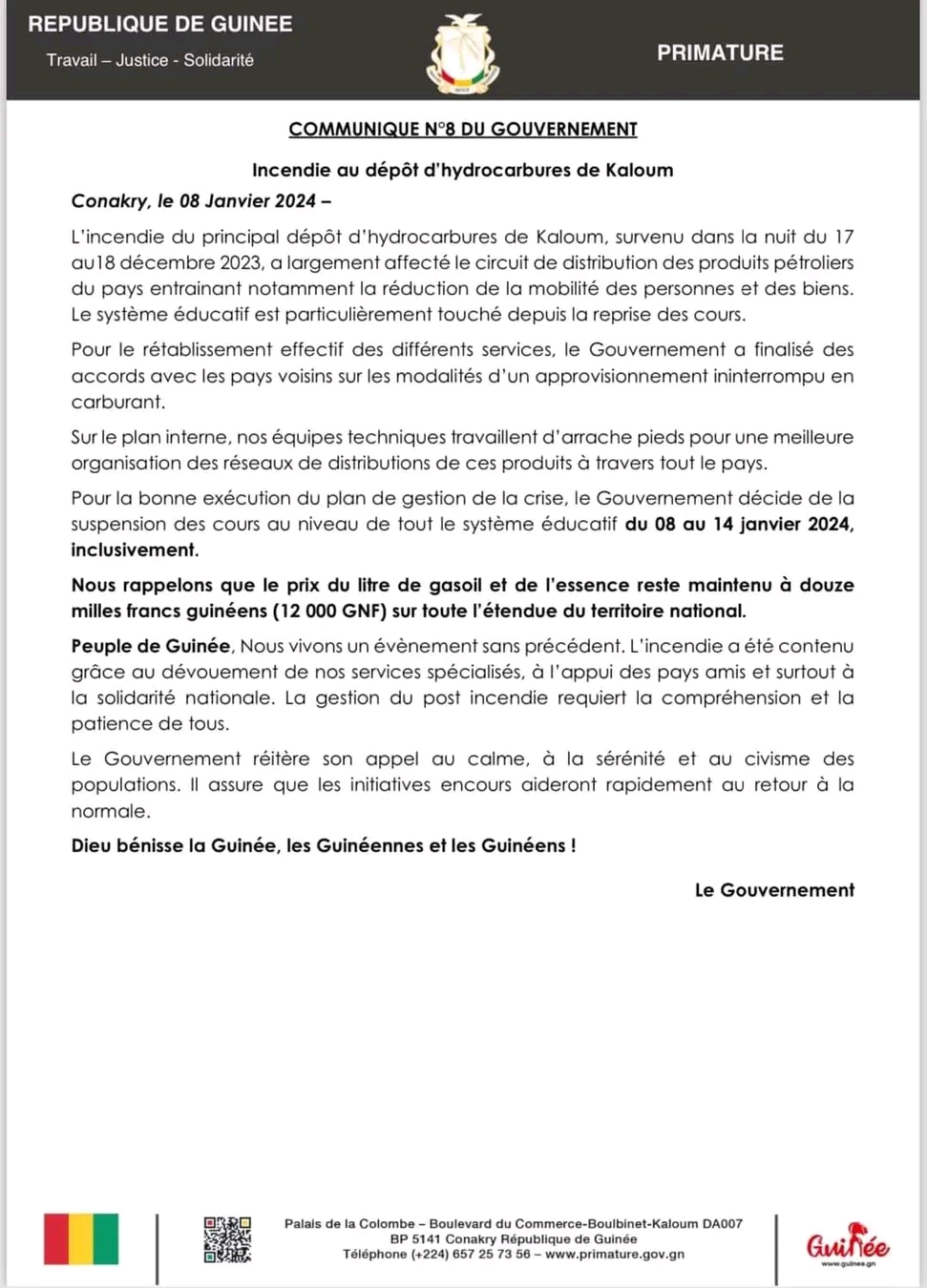 Pour la bonne exécution du plan de gestion de la crise, le gouvernement décide de la suspension des cours au niveau de tout le système éducatif du 08 au 14 janvier 2024, inclusivement.