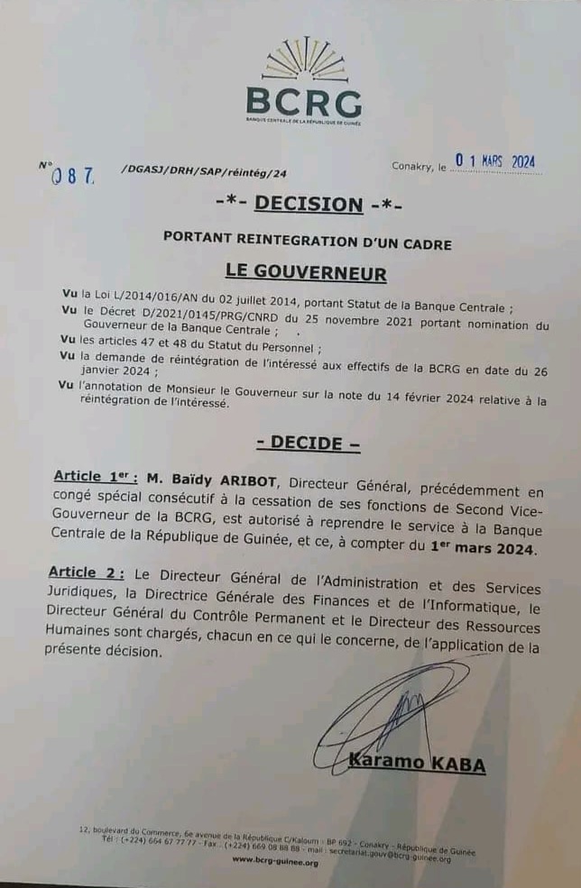 ‘’M. Baïdy Aribot, directeur général, précédemment en congé spécial consécutif à la cessation de ses fonctions de second vice-gouverneur de la BCRG, est autorisé à reprendre le service à la Bangue Centrale de la République de Guinée, et ce, à compter du 1er mars 2024.’’, a ainsi décidé Dr Karamo Kaba, patron de la BCRG.