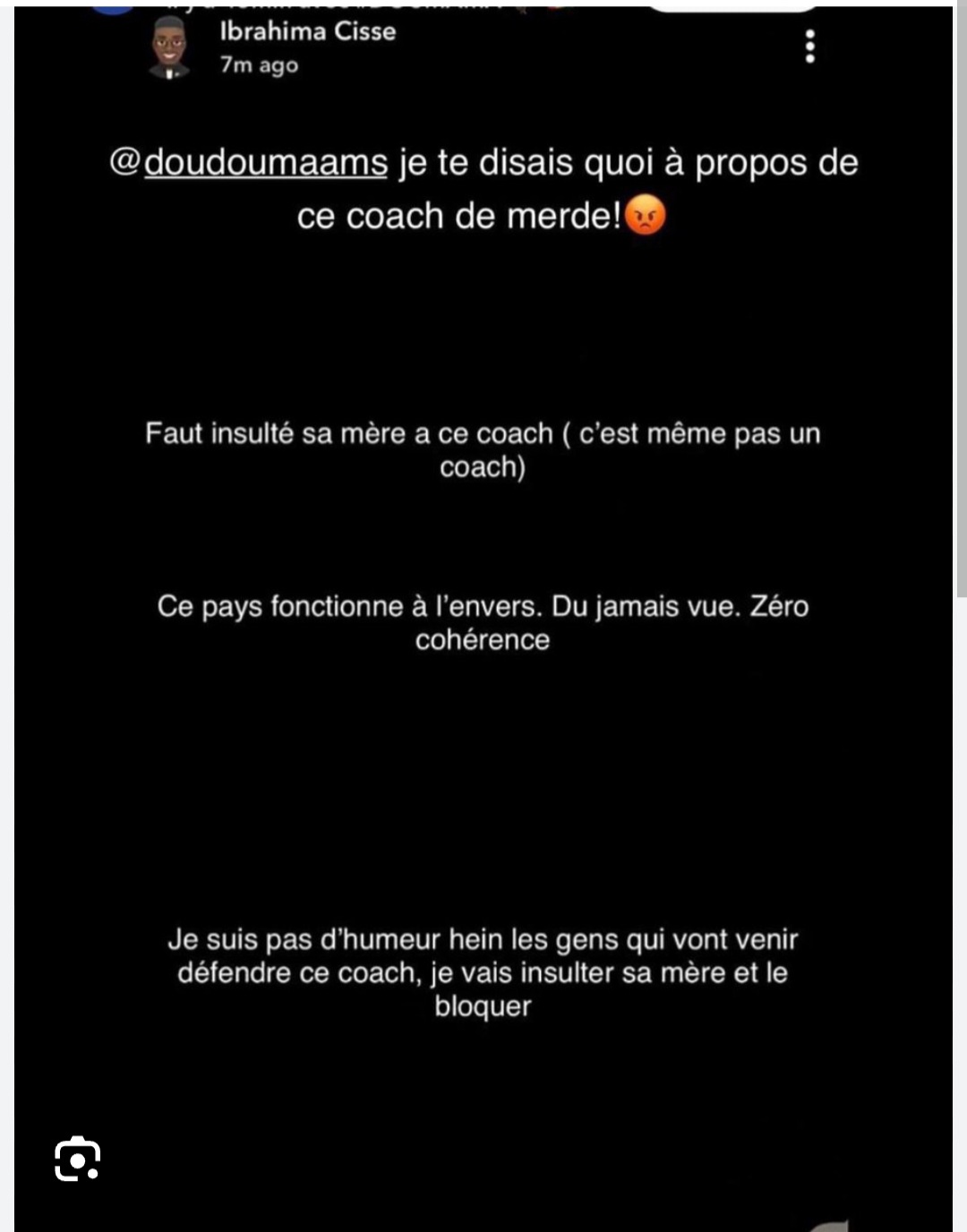«Je te disais quoi à propos de ce coach de m… Faut insulter sa mère à ce coach, ce n’est même pas un coach. Ce pays fonctionne à l’envers. Du jamais vue. Zéro cohérence. Je ne suis pas d’humeur hein les gens qui vont venir défendre ce coach, je vais insulter sa mère et le bloquer», a exprimé avec véhémence le joueur du FK Oural sur Snapchat avant de supprimer son post devant les nombreuses réactions.