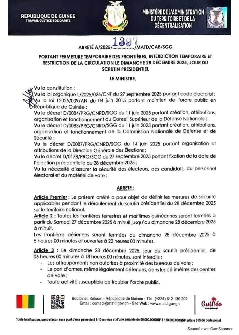 Le général Ibrahima Kalil Condé a annoncé, dans un arrêté, les frontières terrestres et maritimes seront fermées du samedi 27 décembre à minuit au dimanche 28 décembre à minuit. Les frontières aériennes seront, quant à elles, fermées le dimanche 28 décembre de 5h00 à 20h00.