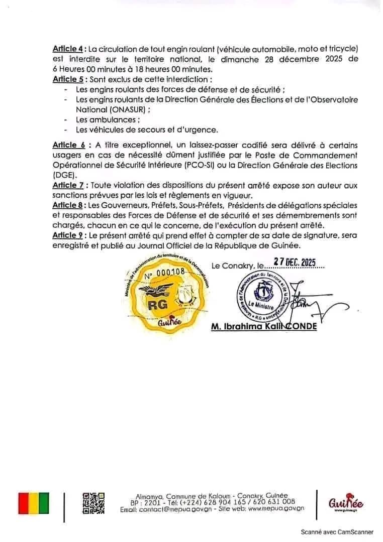 L’article 4 de l’arrêté interdit la circulation pour tout engin roulant (voiture, moto, tricycle) sur l’ensemble du territoire national le dimanche 28 décembre, de 6h00 à 18h00.