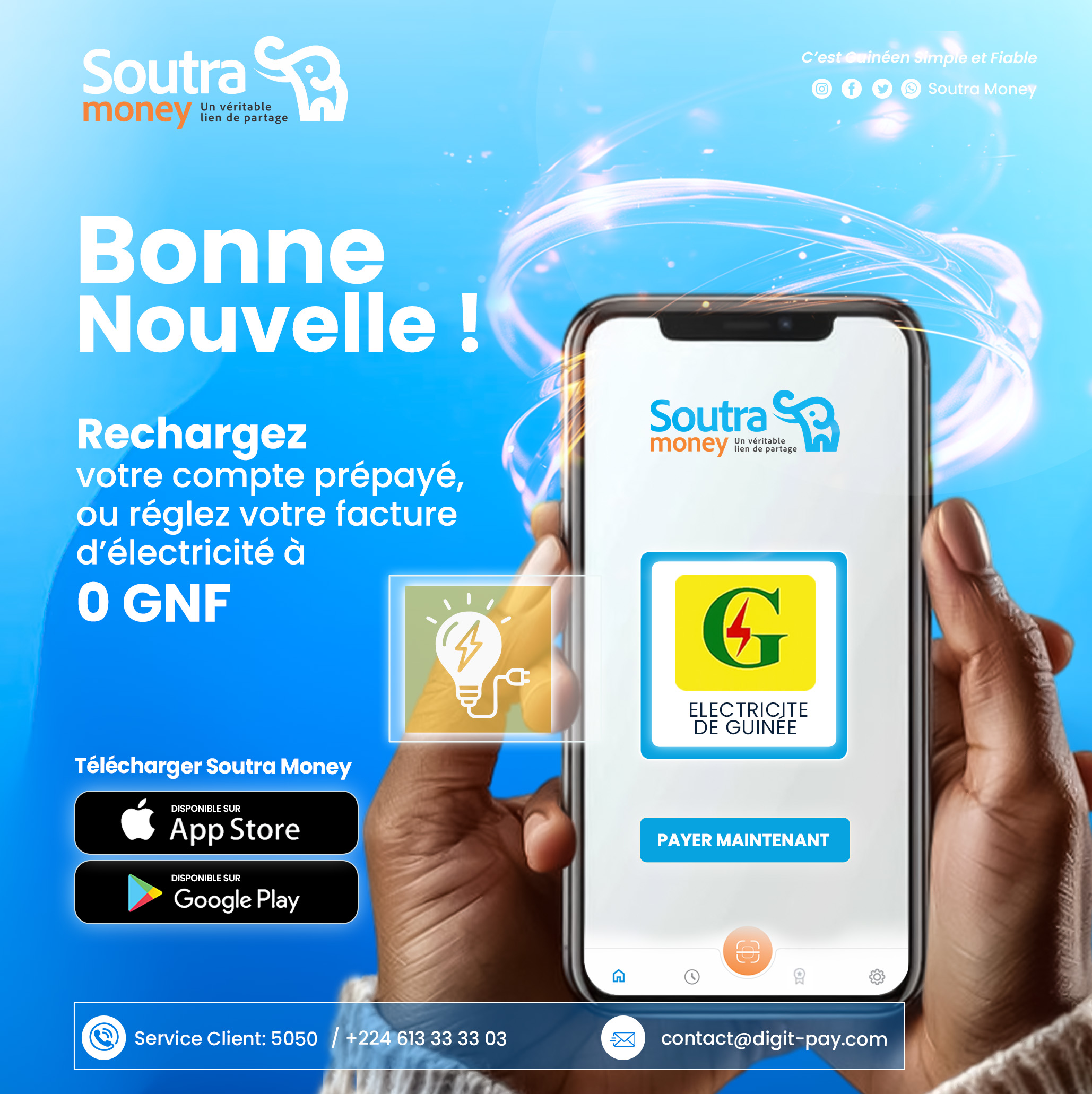 Conakry, le 27 septembre 2025– Soutra Money enrichit son offre. Désormais, chaque guinéen peut régler sa facture d’électricité directement depuis son compte, ou à travers un point de vente Soutra Money. Le service est rapide, sécurisé… et entièrement gratuit pour les usagers !