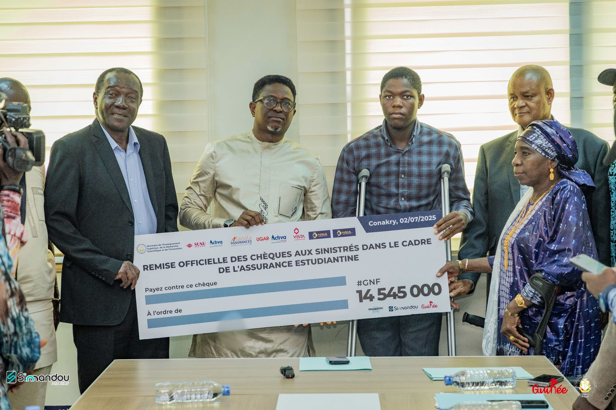 Une avancée historique dans la protection sociale universitaire a été franchie en République de Guinée. Ce mercredi, le ministre de l’Enseignement supérieur, de la Recherche scientifique et de l’Innovation, Alpha Bacar Barry, a procédé à la remise solennelle de chèques d’indemnisation à des étudiants victimes d’accidents graves, dans le cadre de la mise en œuvre du programme pilote d’assurance estudiantine.